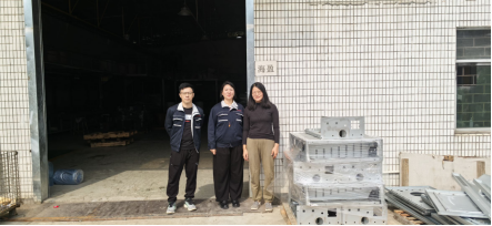 现场检测人员周志洋、何镇明与企业陪同人张美玲在车间门口合影 |