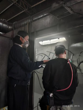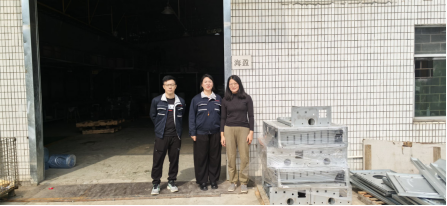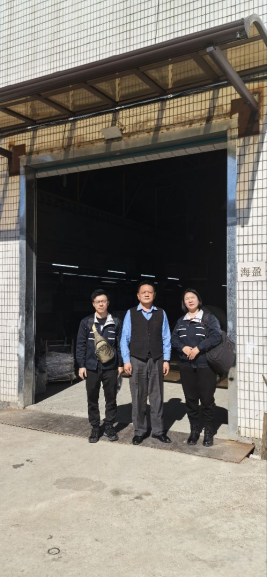 现场检测人员周志洋、何镇明与企业陪同人张美玲在车间门口合影 |